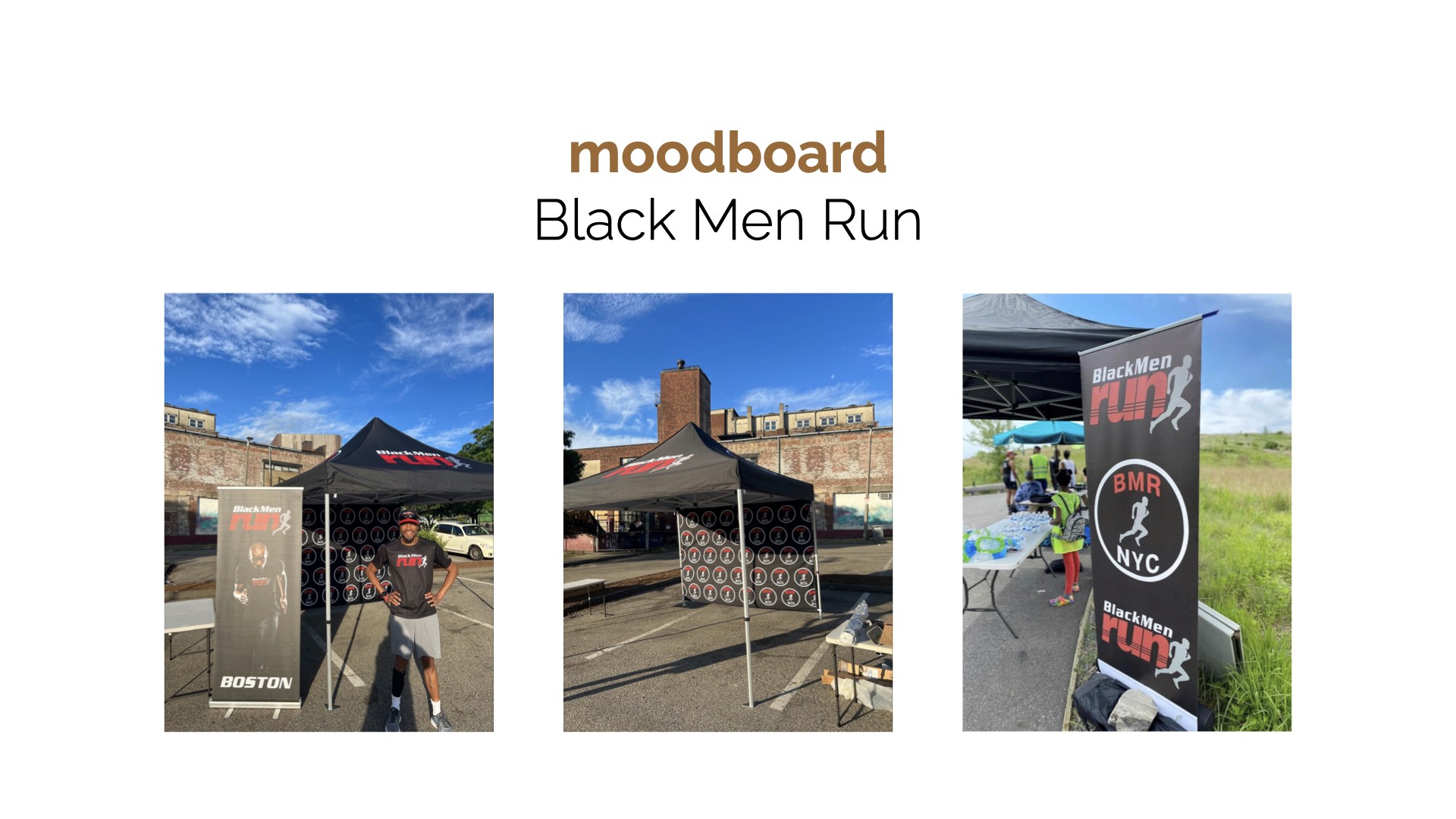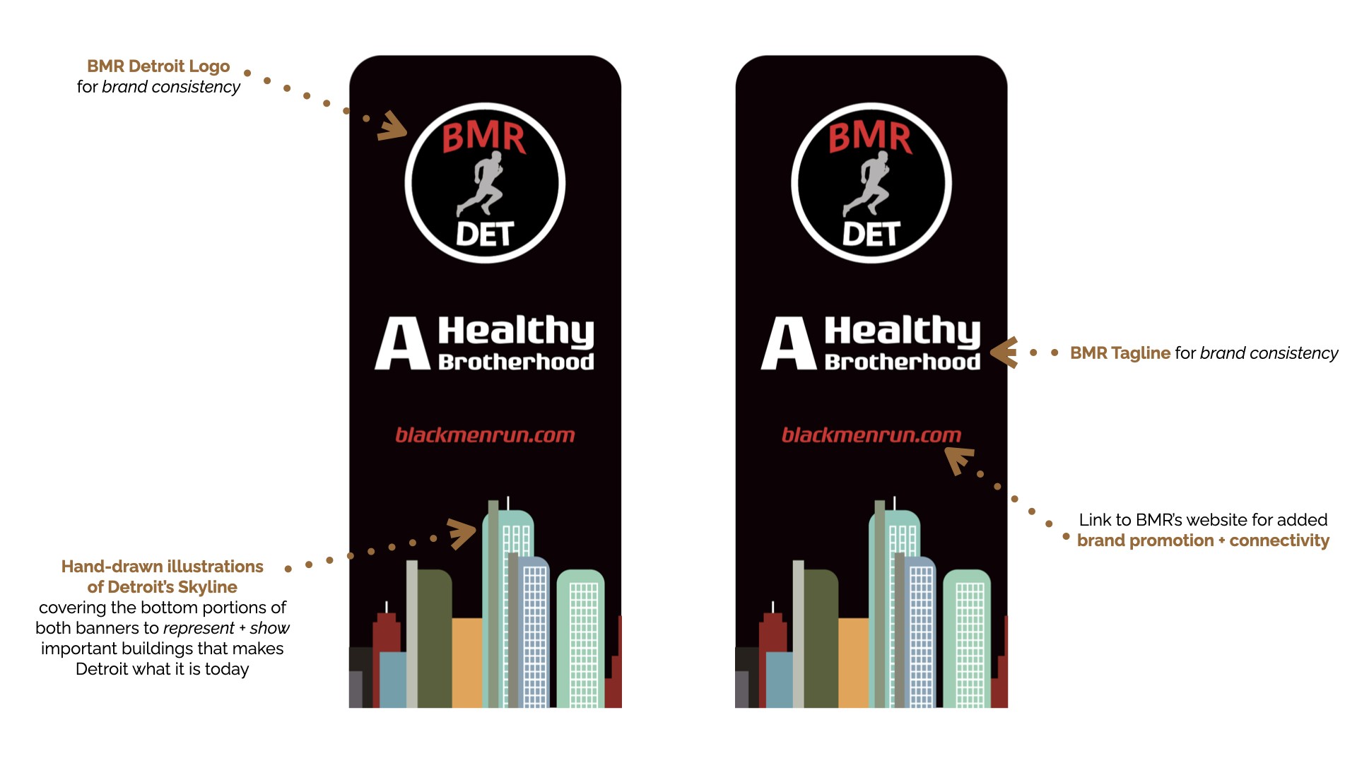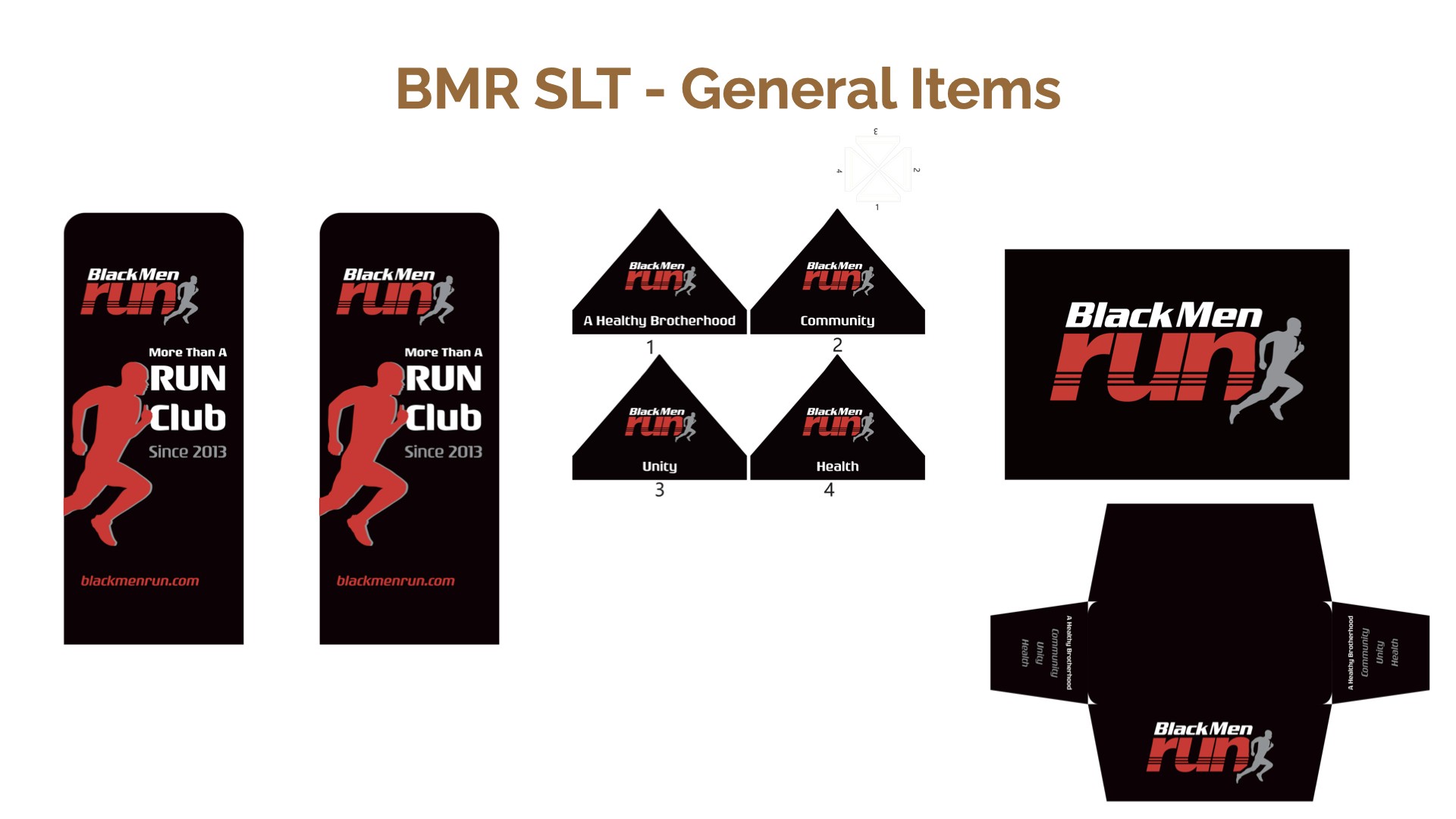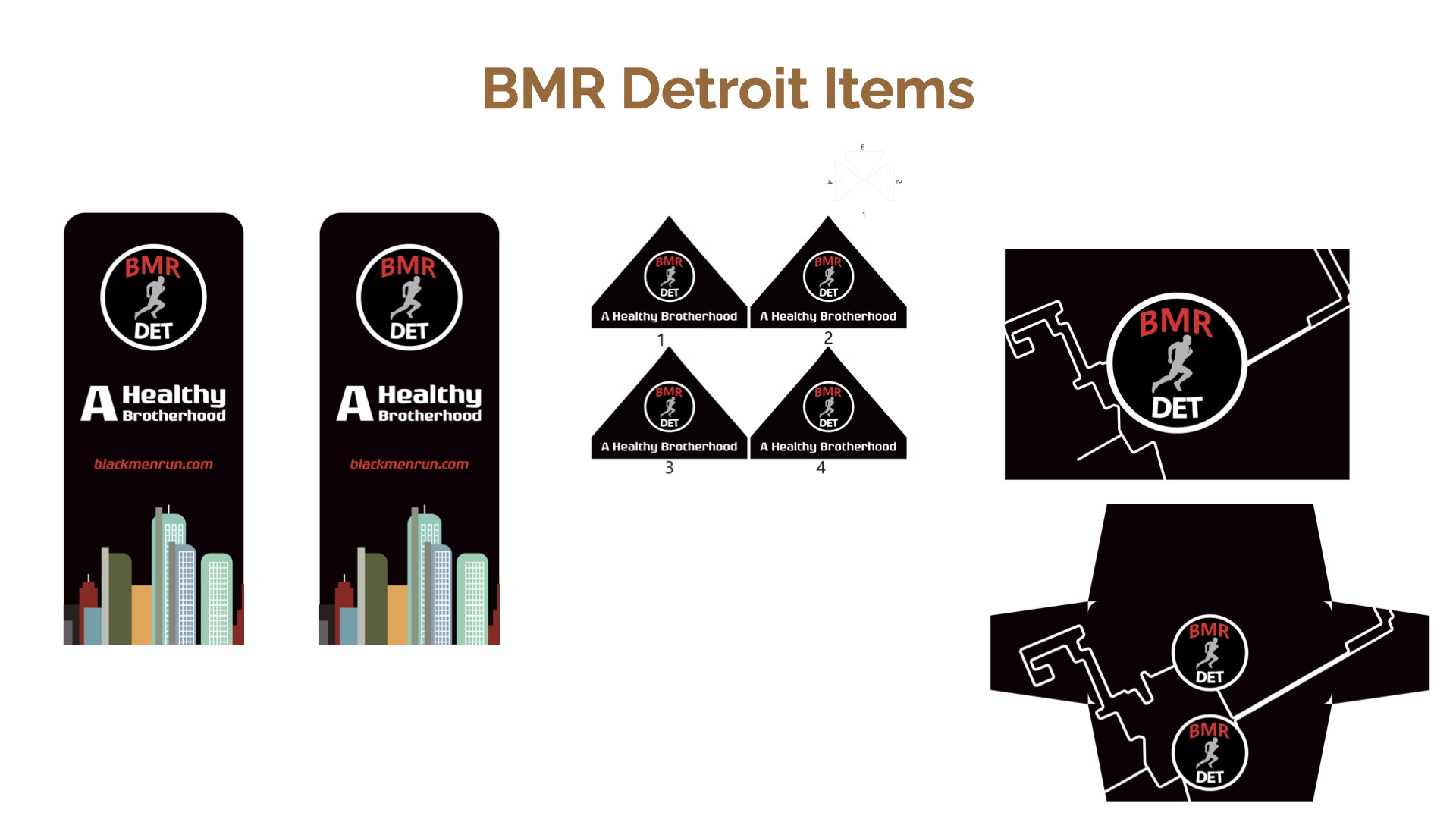 Black Men Run Inc. (BMR) is an independent running group focused on promoting a healthy lifestyle among African-American males through participating in recreational running activities. The primary goal of this project was to create designs for six vertical banners, two tents, and 2 table throws to be used amongst the national chapter and BMR Detroit chapter. The project started in the sketching phase for requested items, progressed to the revision phase, and finished with the final physical compositions.