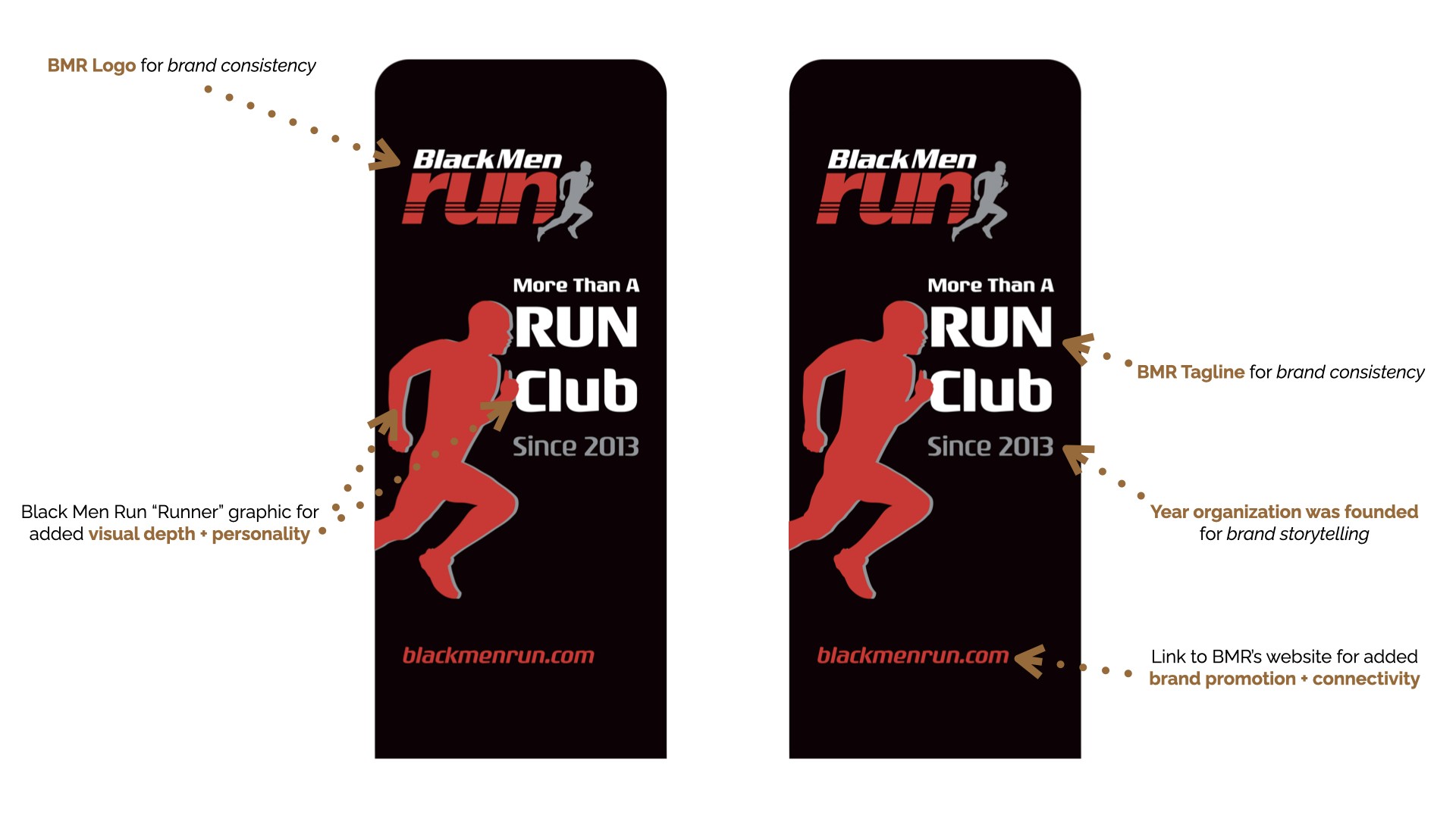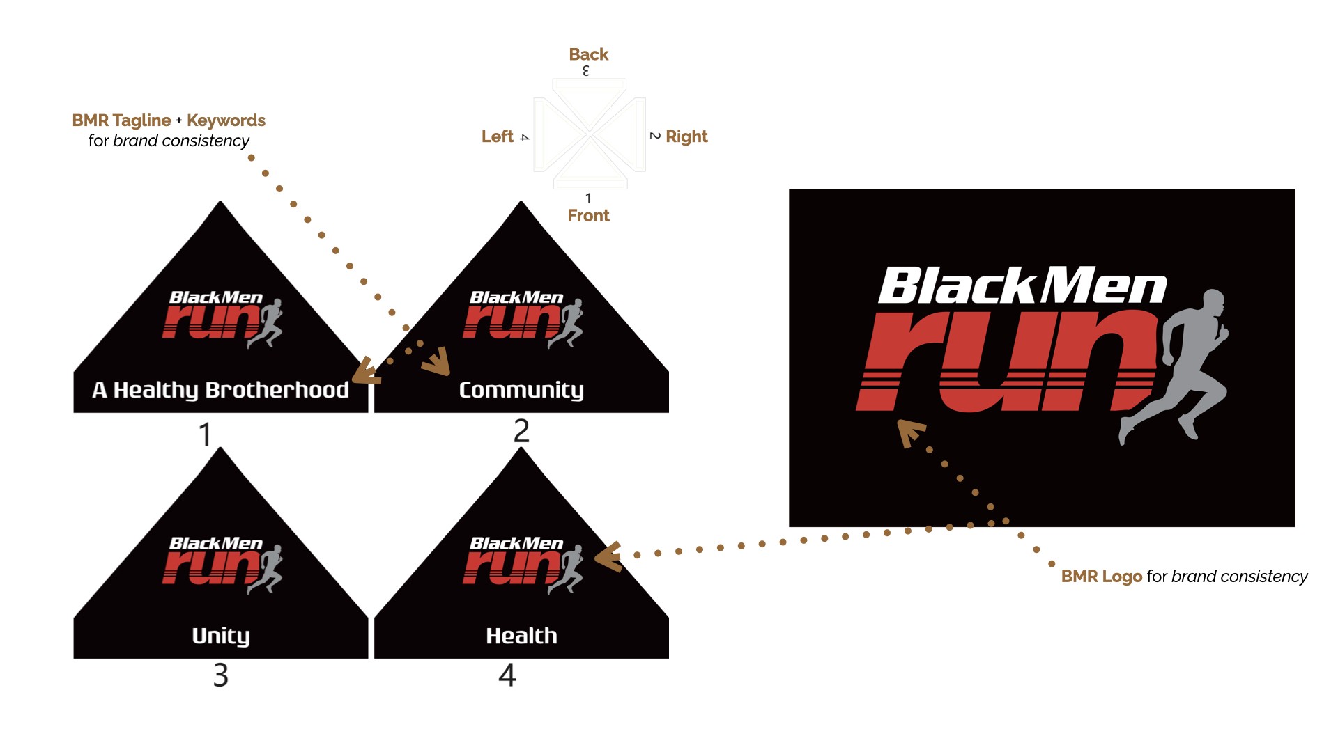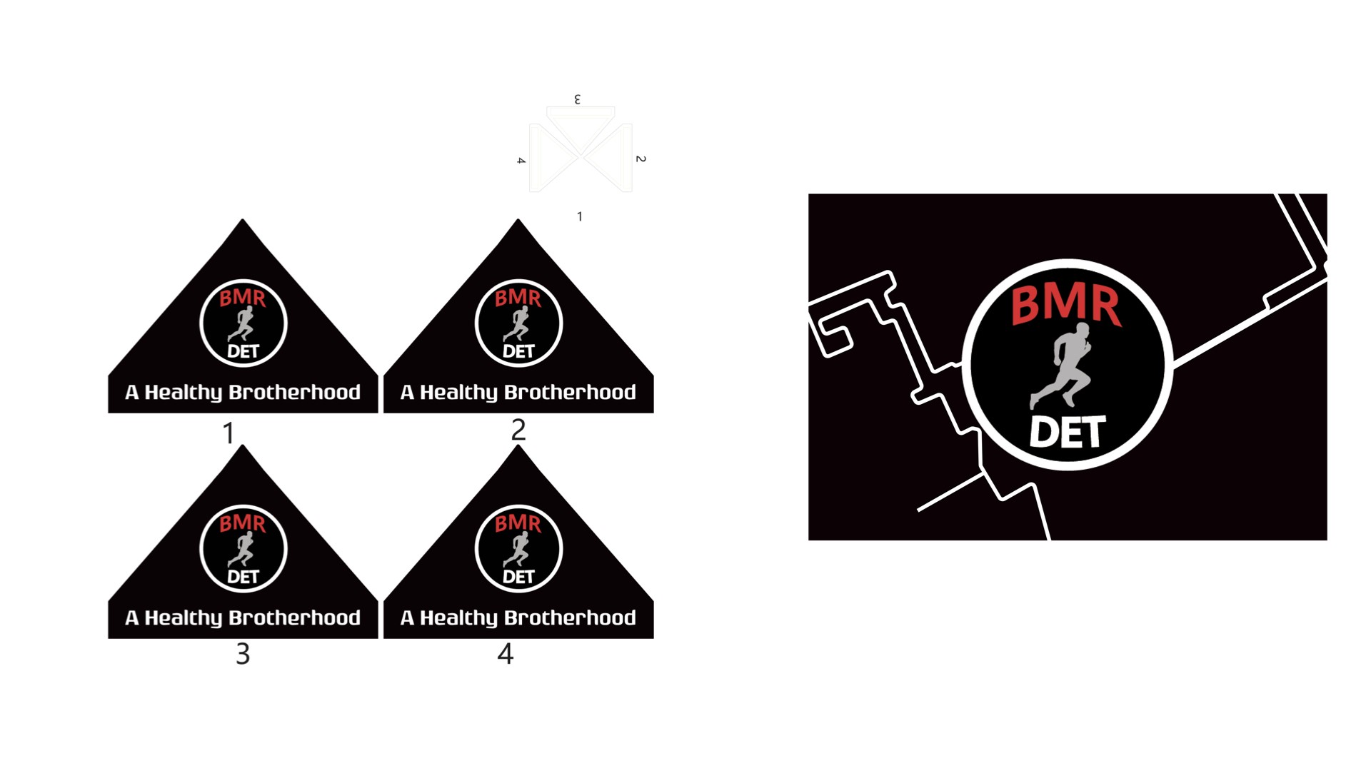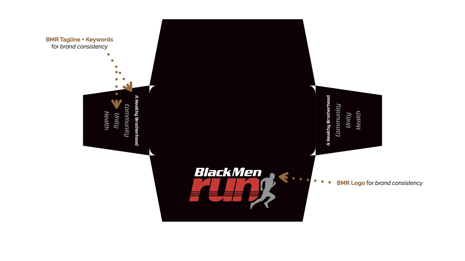 Black Men Run Inc. (BMR) is an independent running group focused on promoting a healthy lifestyle among African-American males through participating in recreational running activities. The primary goal of this project was to create designs for six vertical banners, two tents, and 2 table throws to be used amongst the national chapter and BMR Detroit chapter. The project started in the sketching phase for requested items, progressed to the revision phase, and finished with the final physical compositions.
