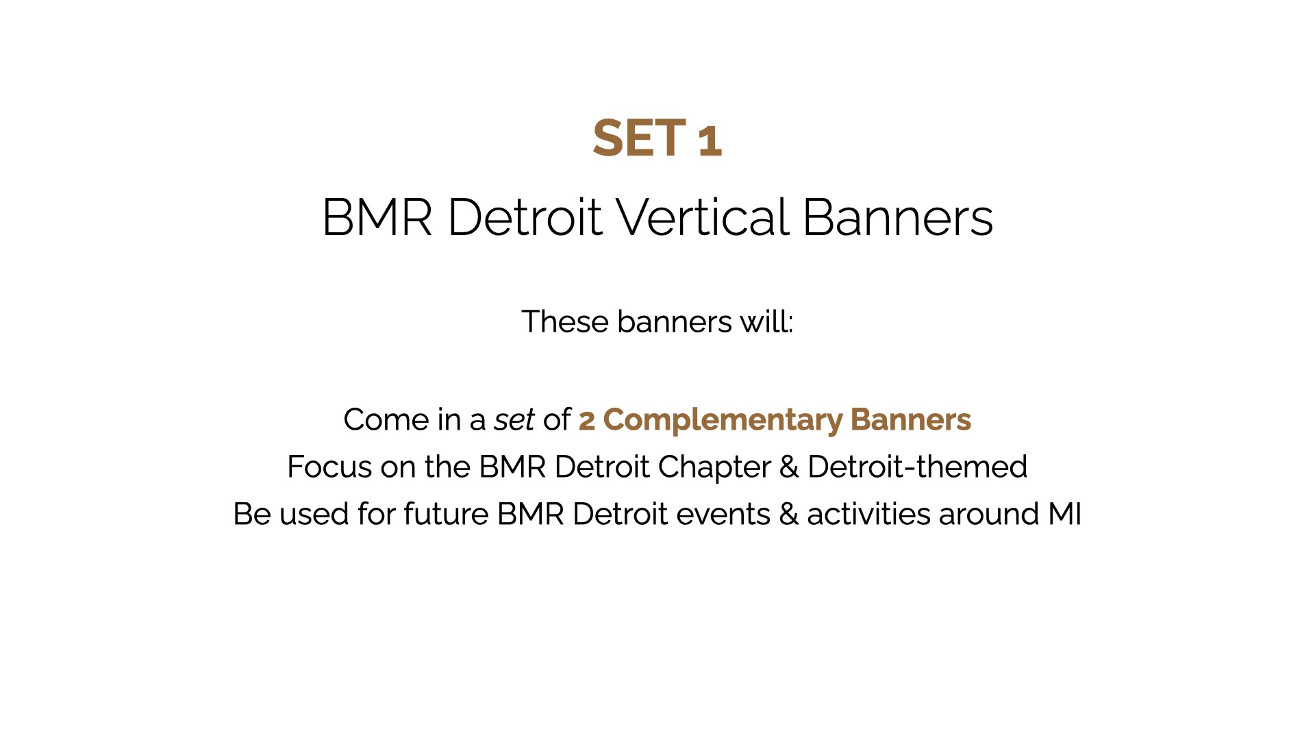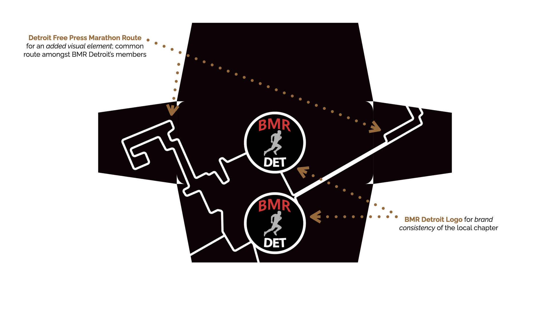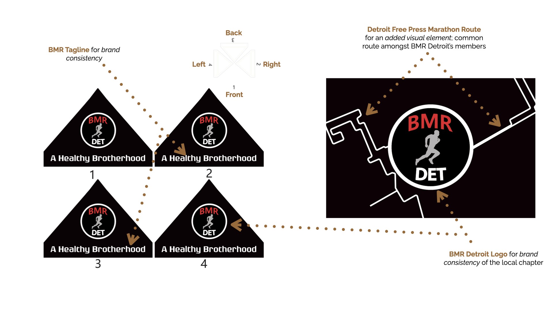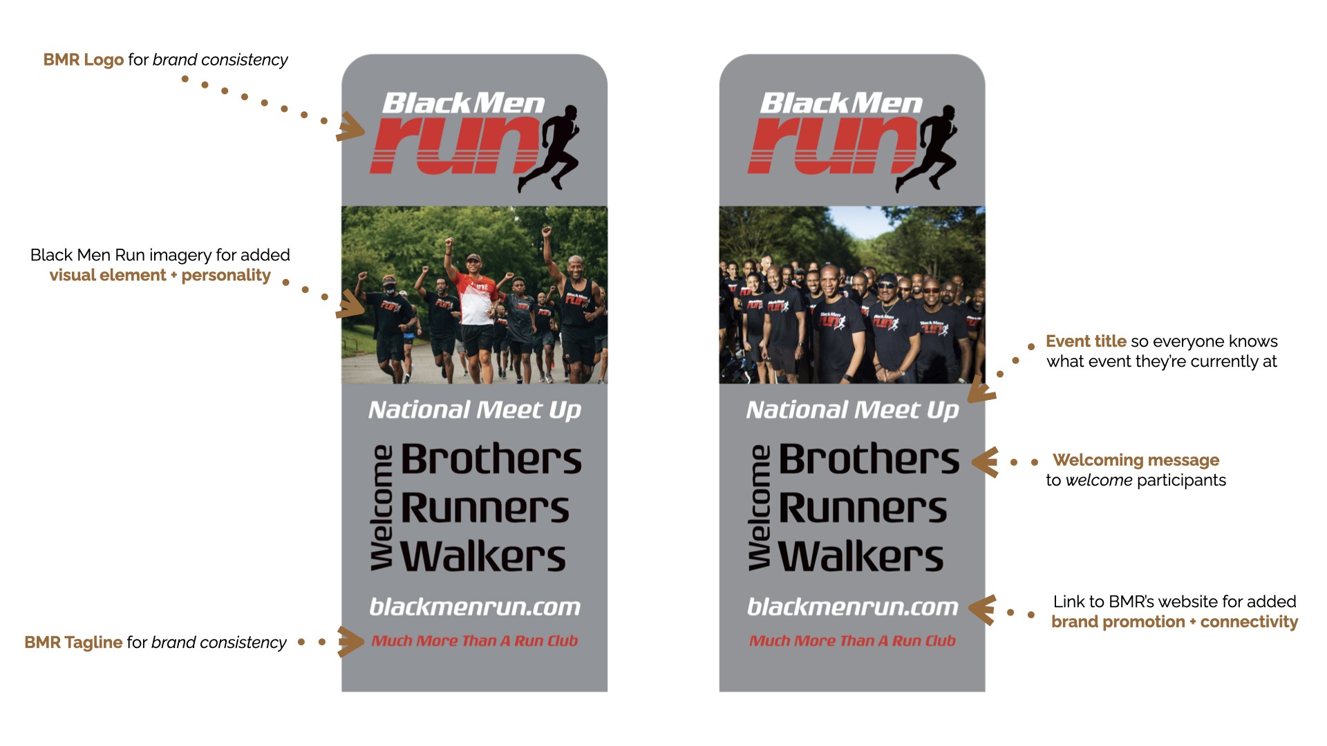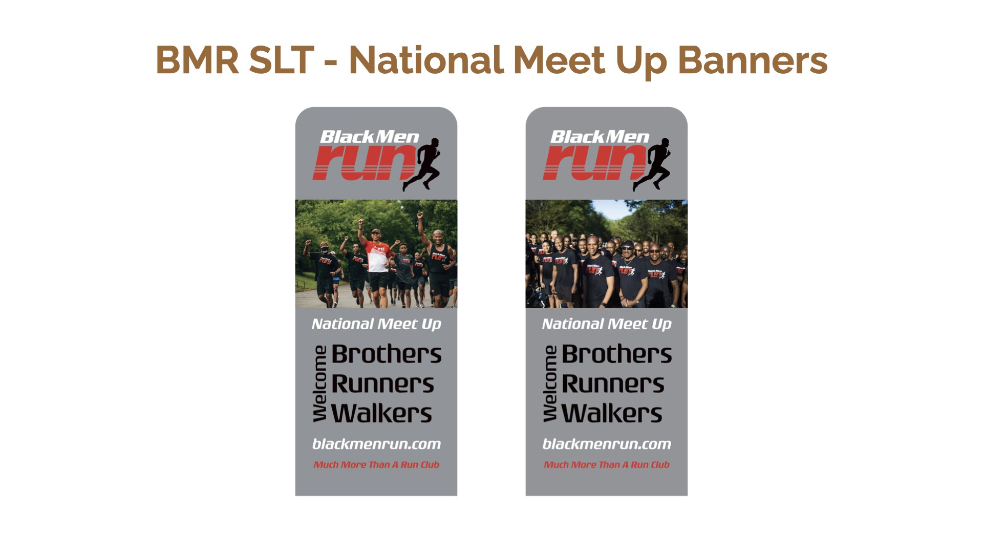 Black Men Run Inc. (BMR) is an independent running group focused on promoting a healthy lifestyle among African-American males through participating in recreational running activities. The primary goal of this project was to create designs for six vertical banners, two tents, and 2 table throws to be used amongst the national chapter and BMR Detroit chapter. The project started in the sketching phase for requested items, progressed to the revision phase, and finished with the final physical compositions.